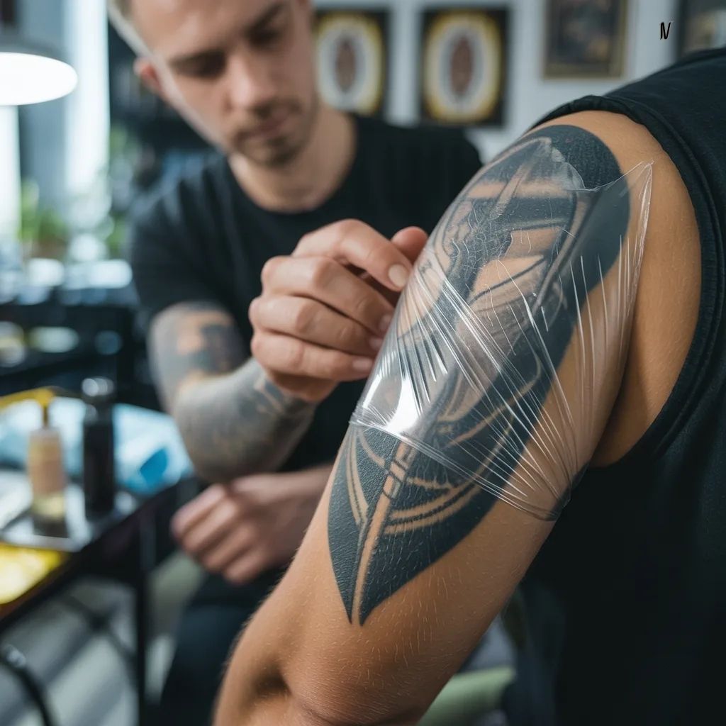 Right after your tattoo is completed, your artist will cover it with a protective bandage or plastic wrap. This bandage helps protect your new ink from bacteria, dirt, and potential irritation.