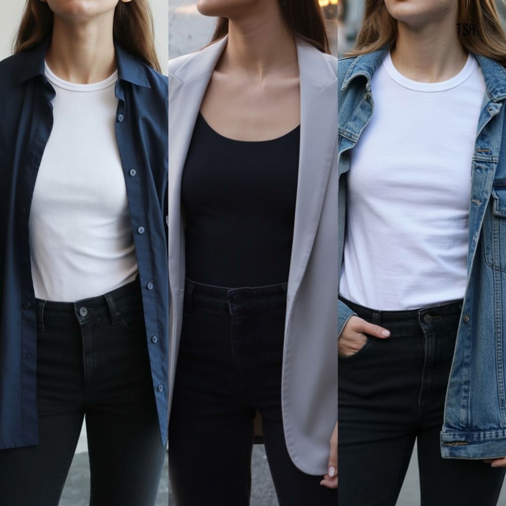 Choose something that adds a different texture or line than your top, because that contrast is what makes it feel styled. A fitted tee under an open button-up looks intentional. A tank under a light blazer looks polished. A plain tee under a denim jacket looks classic.