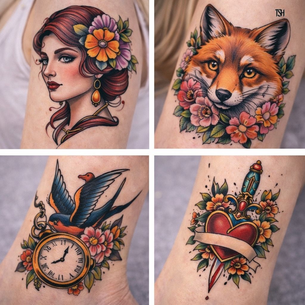 Neo-traditional tattoos build on the foundation of traditional tattooing but introduce more detail and artistic freedom. The style keeps bold outlines but expands the color range and shading techniques.