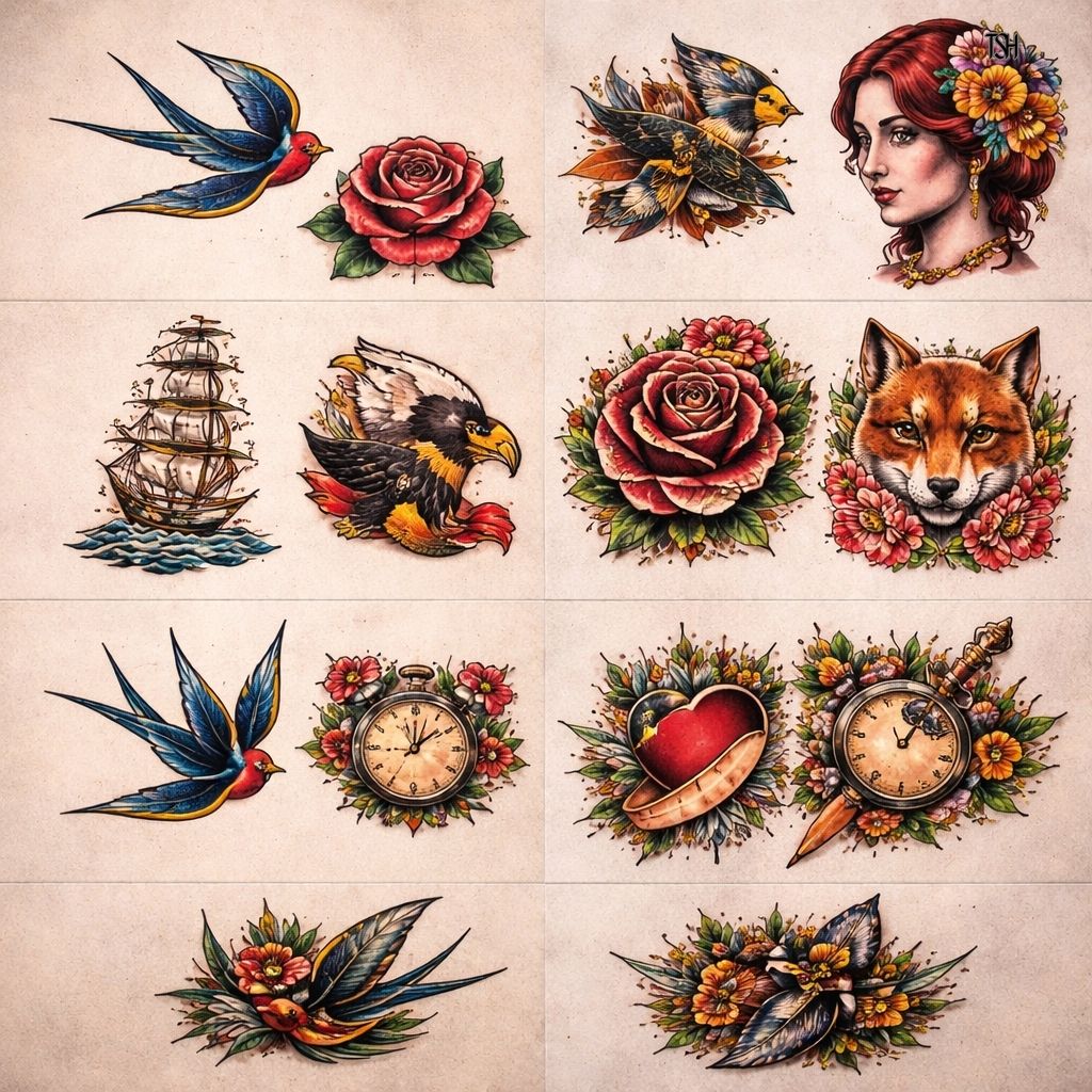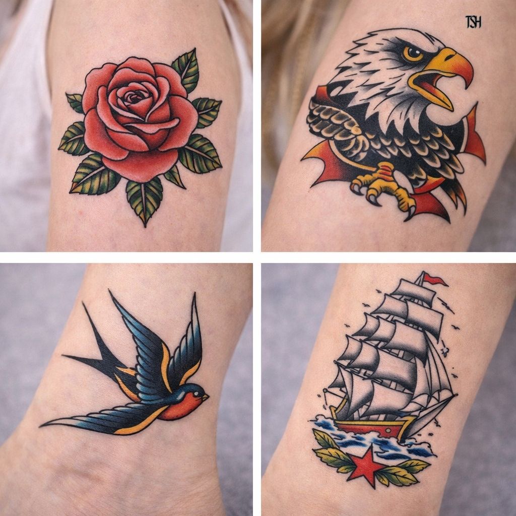 - iconic imagery like anchors, roses, eagles, and daggers